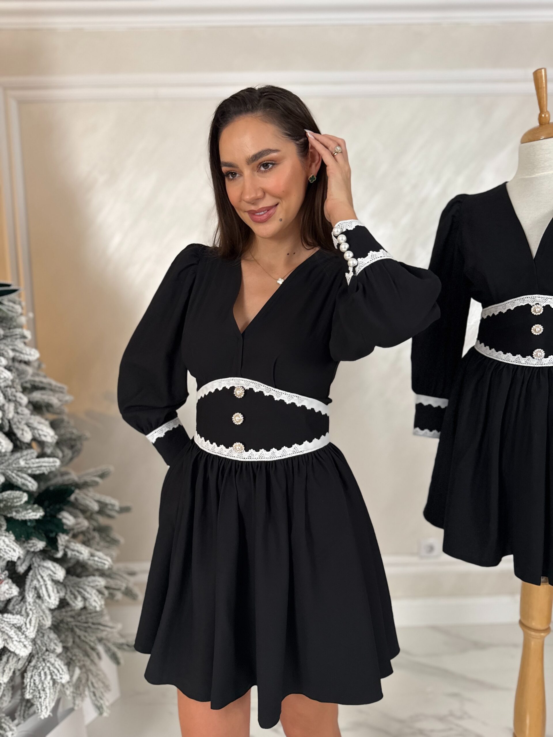 Confecționată din vâscoză neagră, cu detalii albe din bumbac aplicate la nivelul taliei și manșetelor, rochia se remarcă prin contrastul elegant și atenția la detalii. Fusta lejeră, cu volum, adaugă fluiditate și mișcare, fiind perfectă atât pentru evenimente speciale, cât și pentru apariții chic de zi.