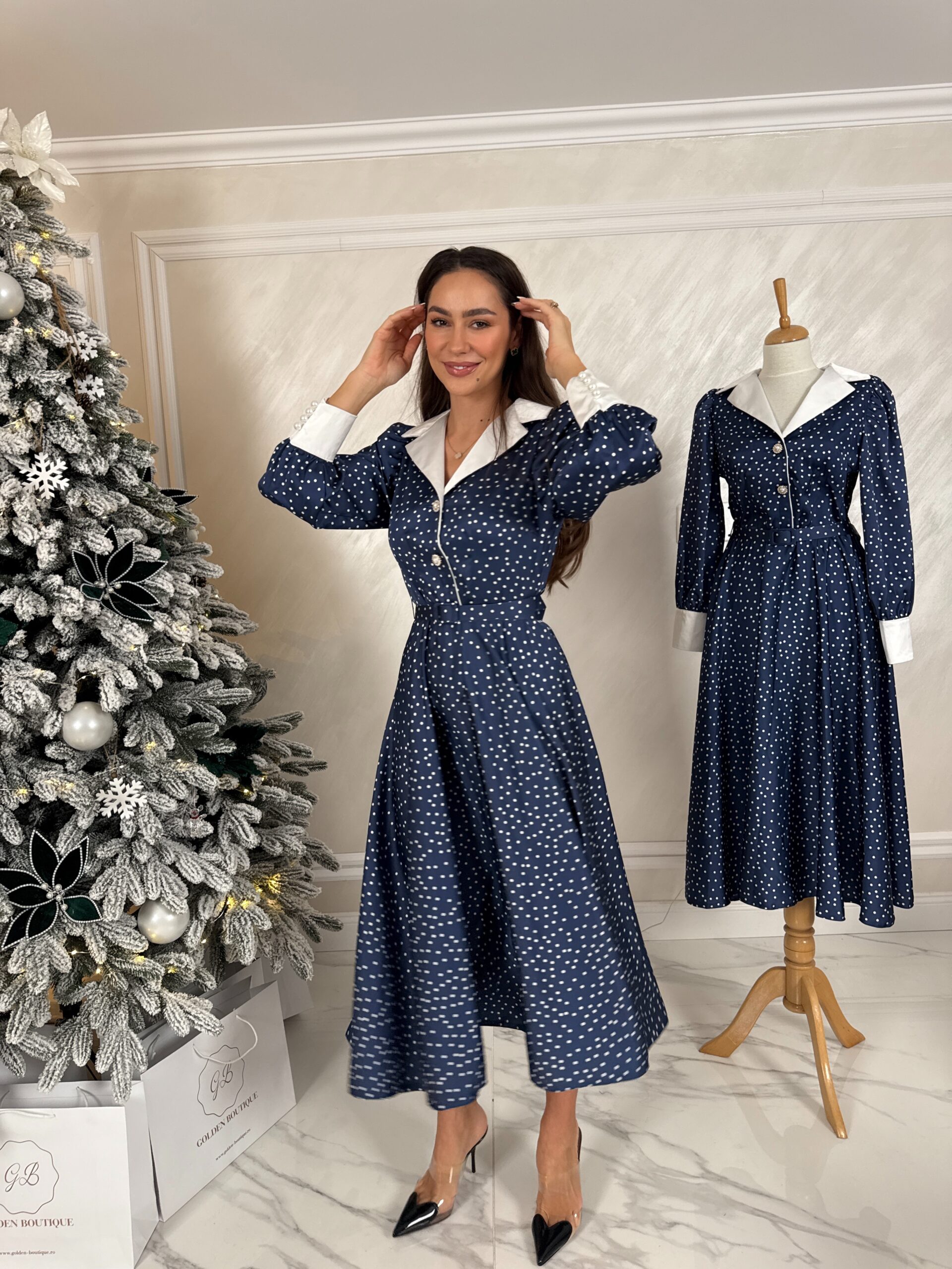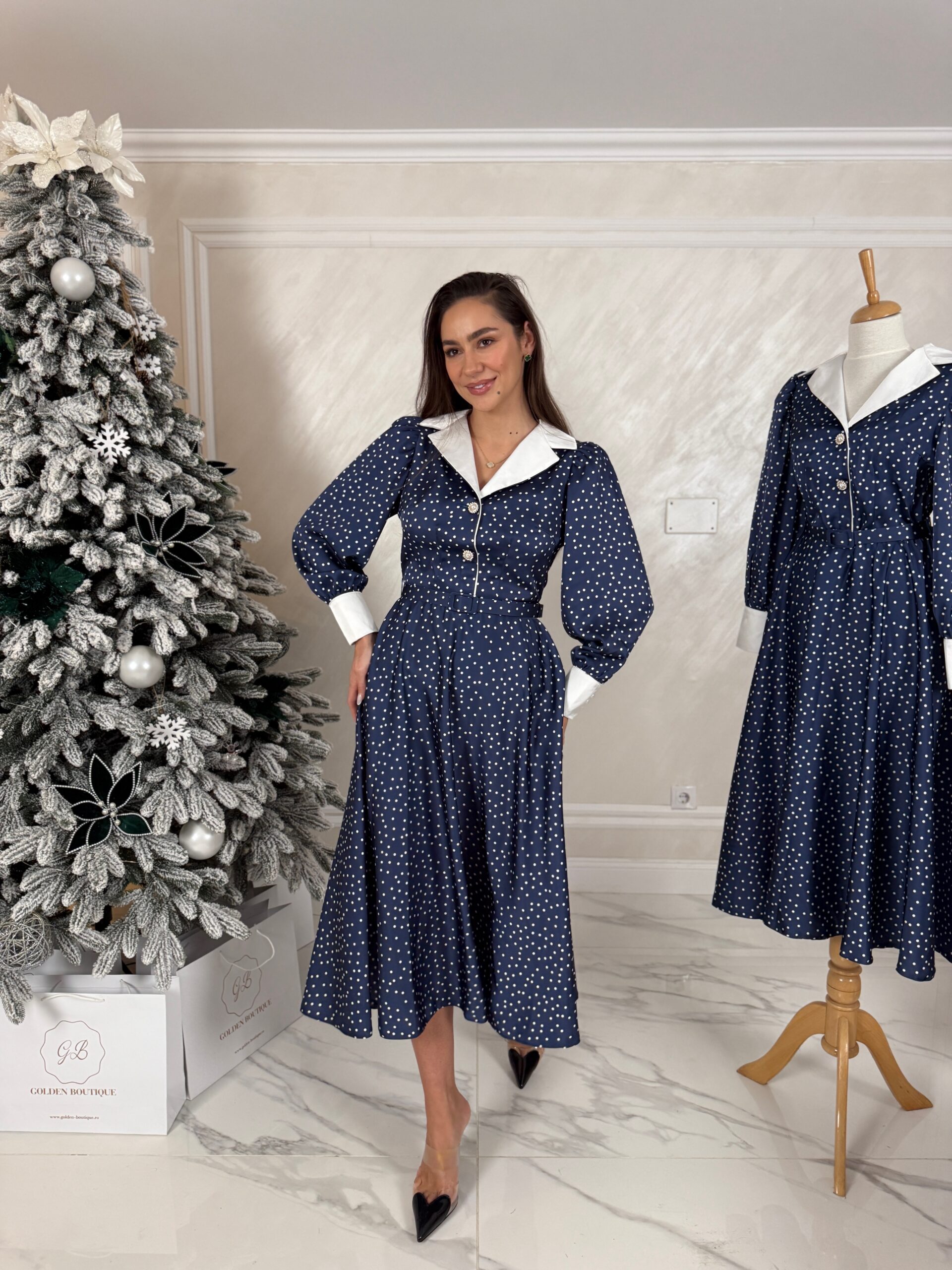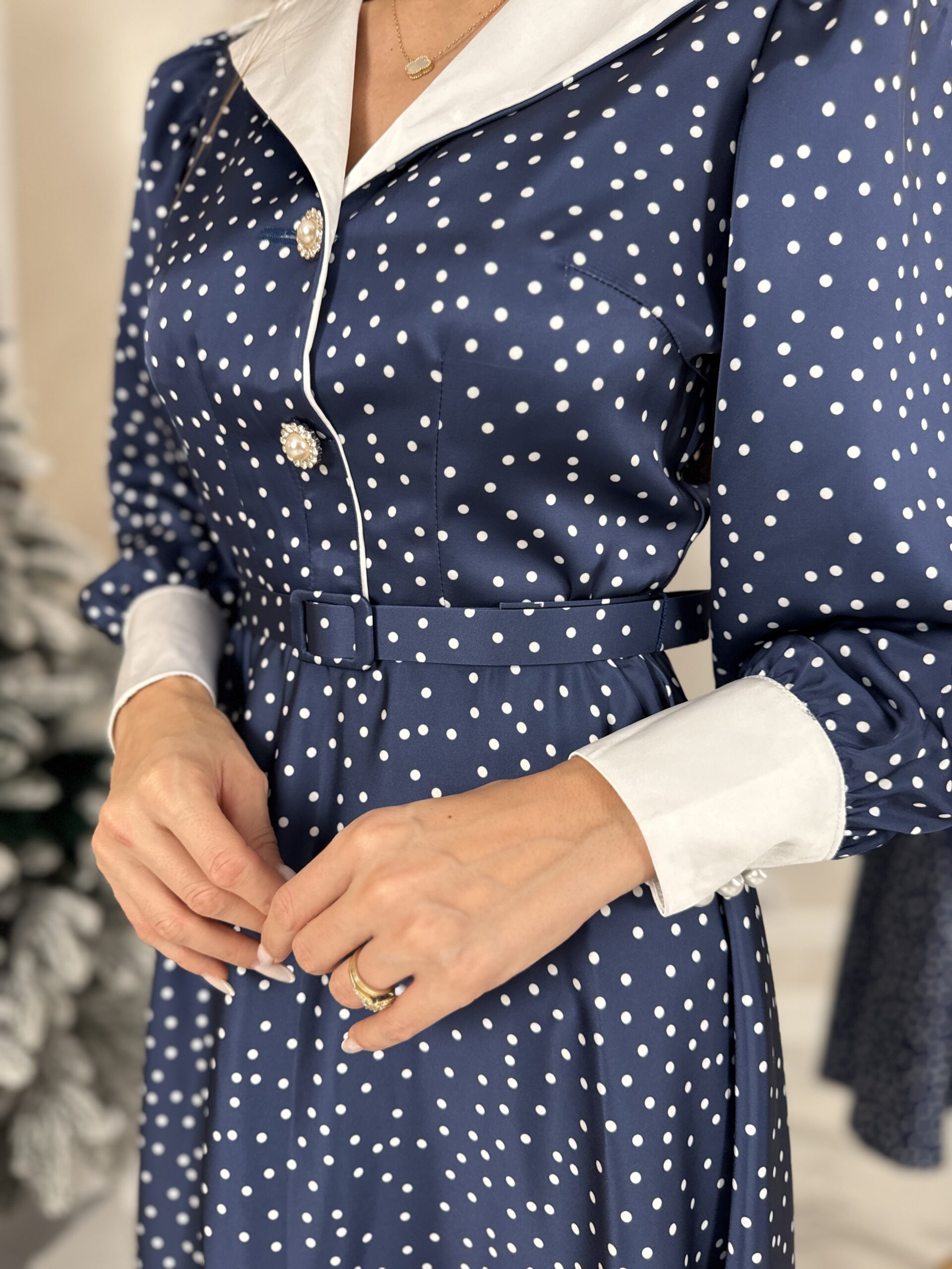 Feminina și sofisticată, rochia Florance este creată pentru a te face să te simți elegantă în orice moment. Croiala cu talie bine definită , cu un guler si mansete asortate cu bulinlele, alungește silueta și oferă un aer rafinat.