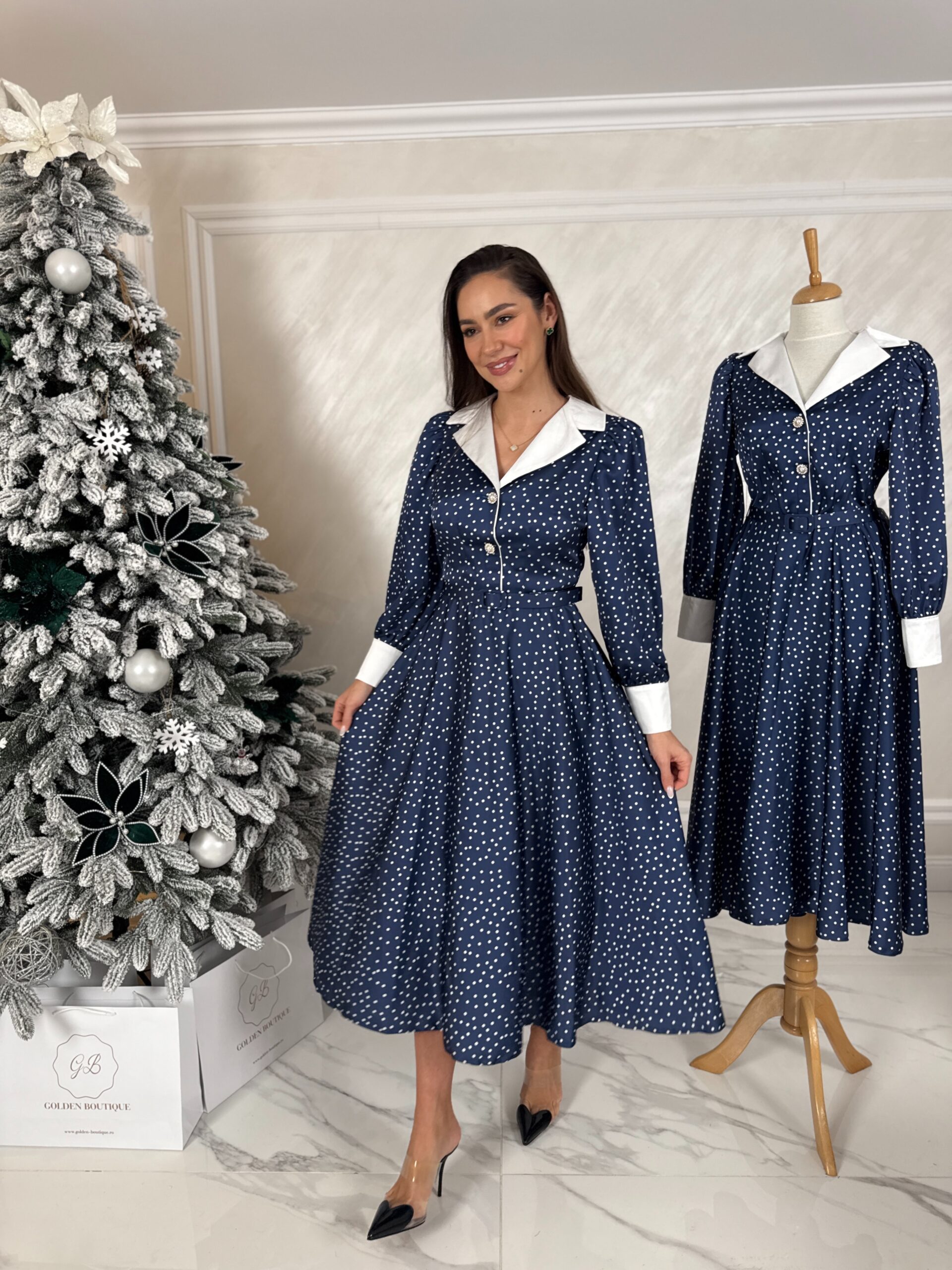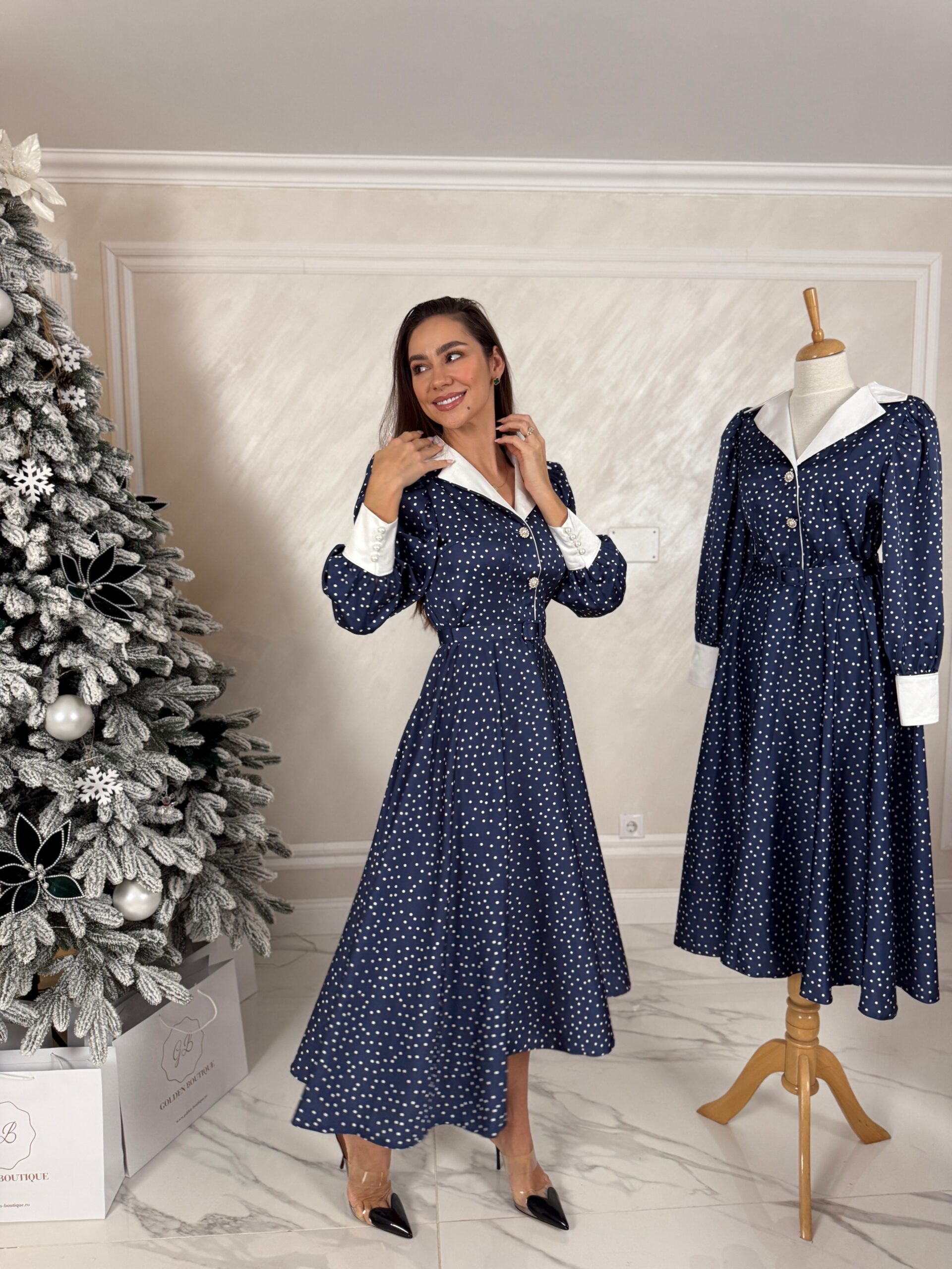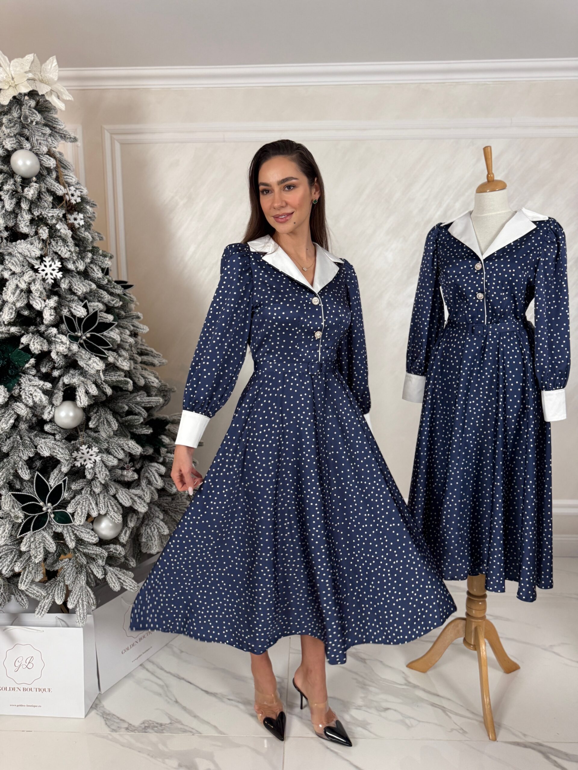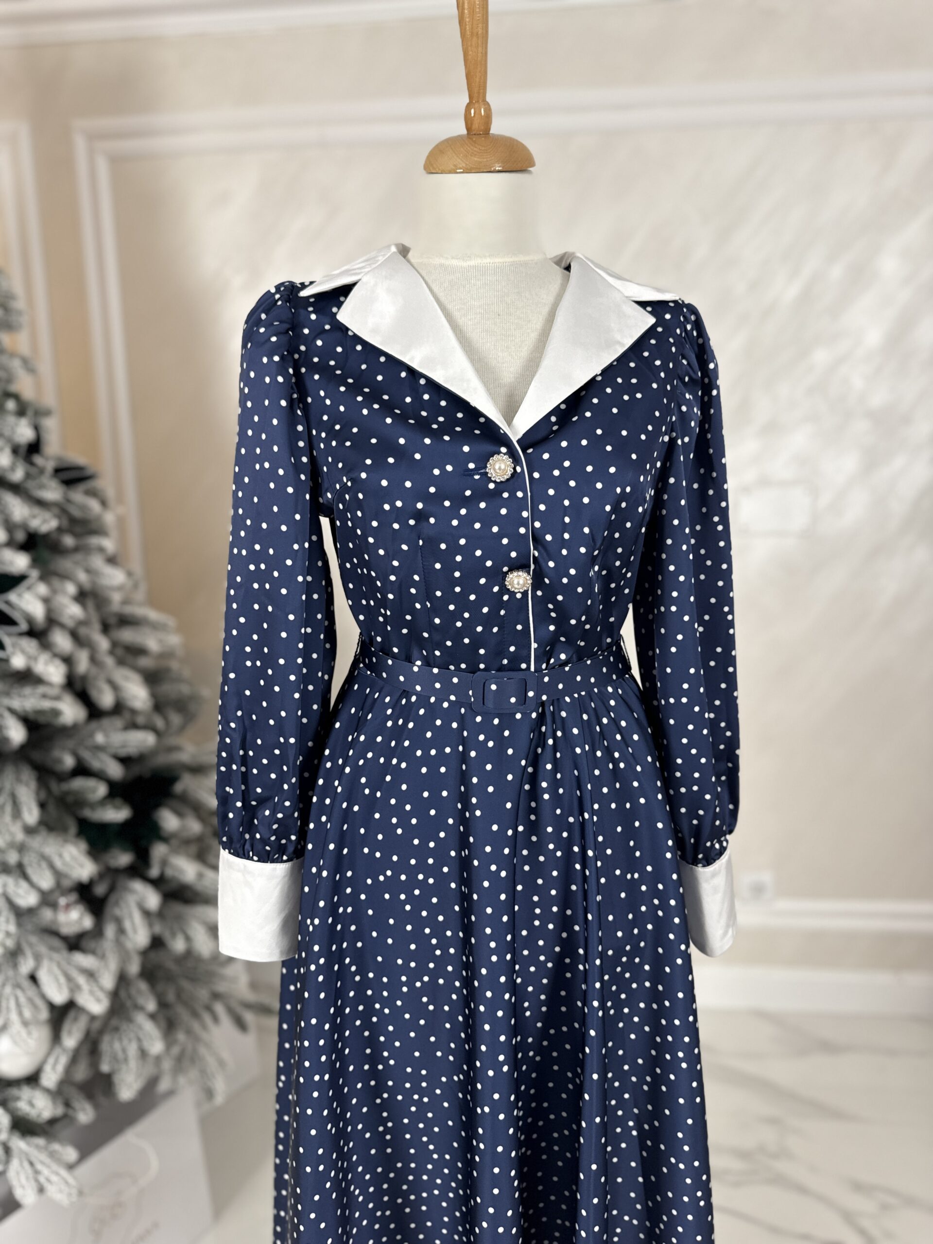 Feminina și sofisticată, rochia Florance este creată pentru a te face să te simți elegantă în orice moment. Croiala cu talie bine definită , cu un guler si mansete asortate cu bulinlele, alungește silueta și oferă un aer rafinat.
