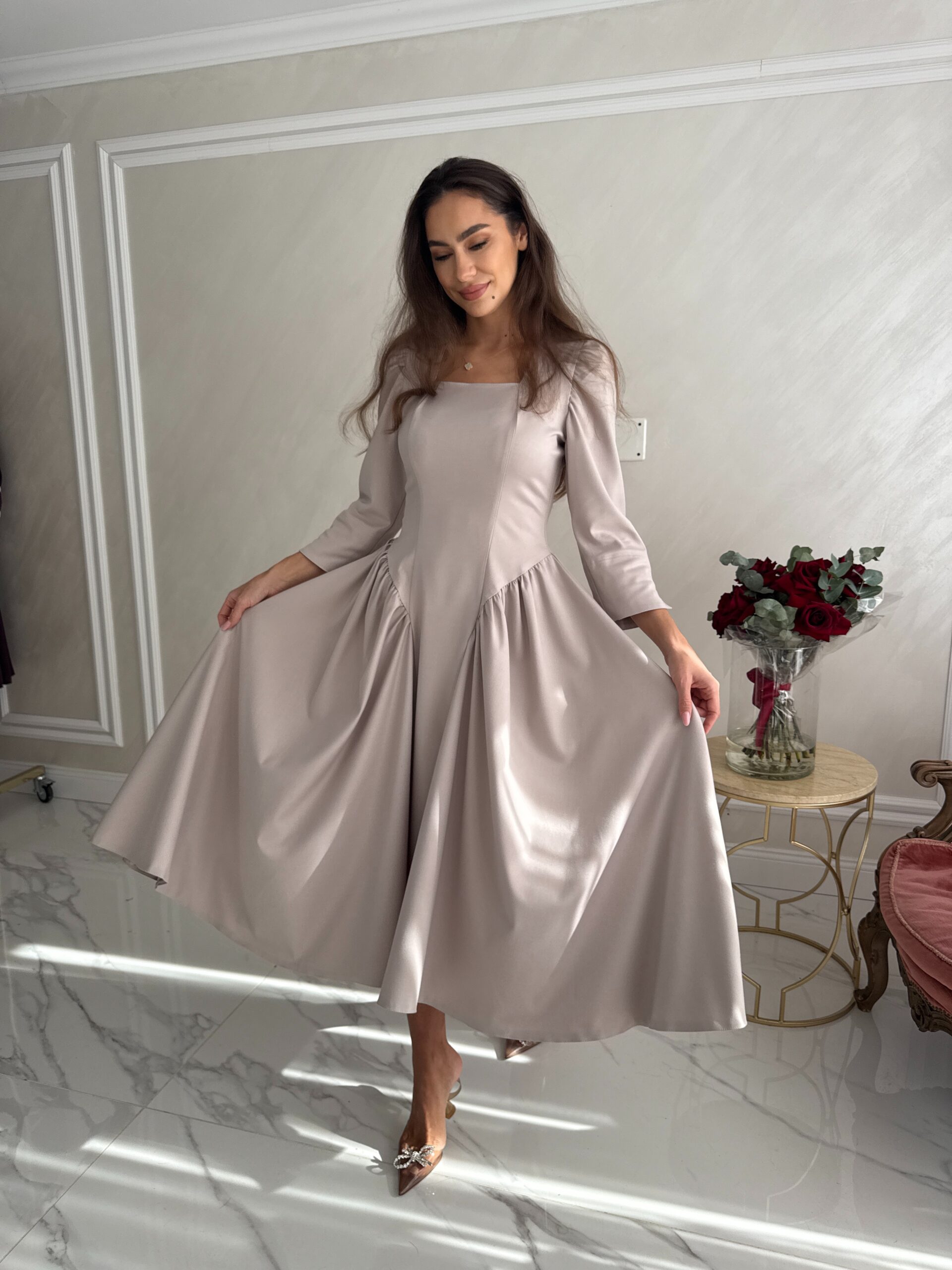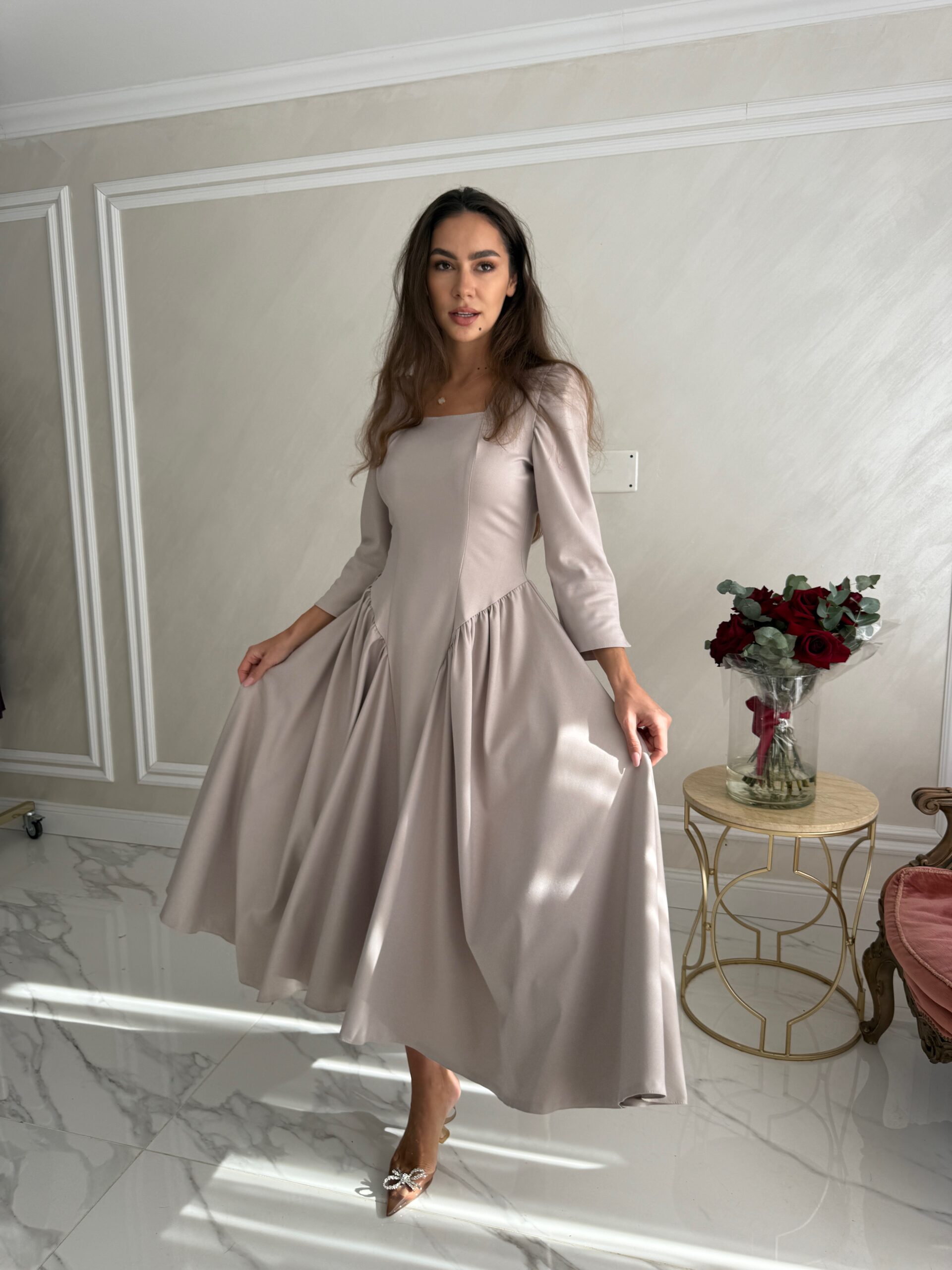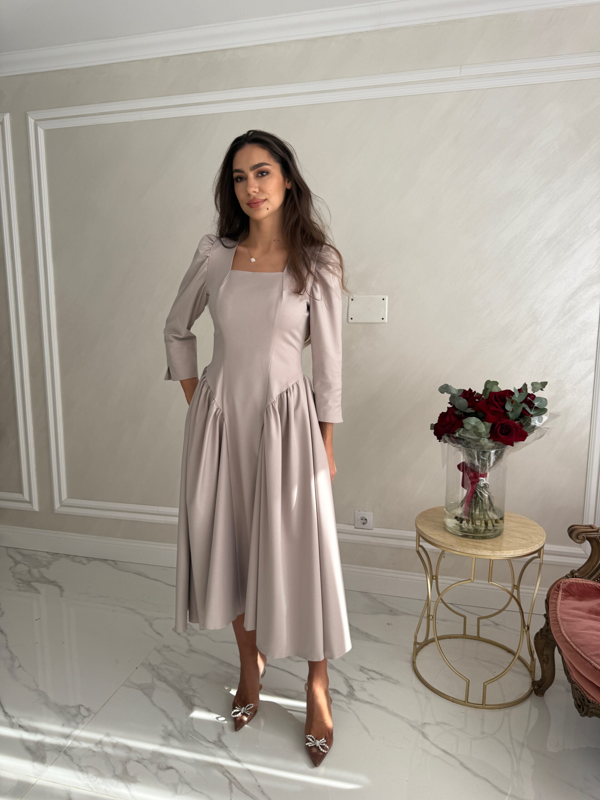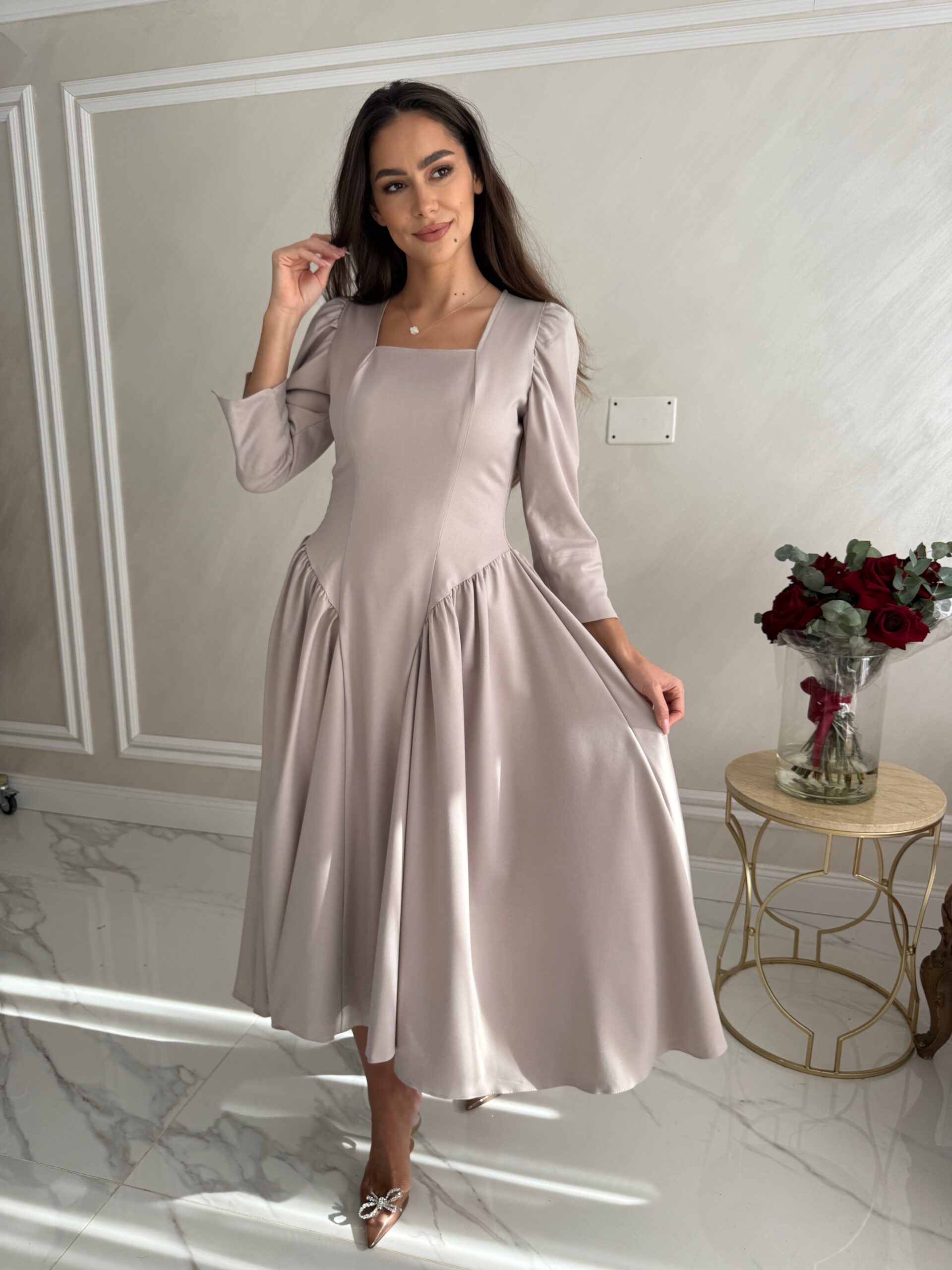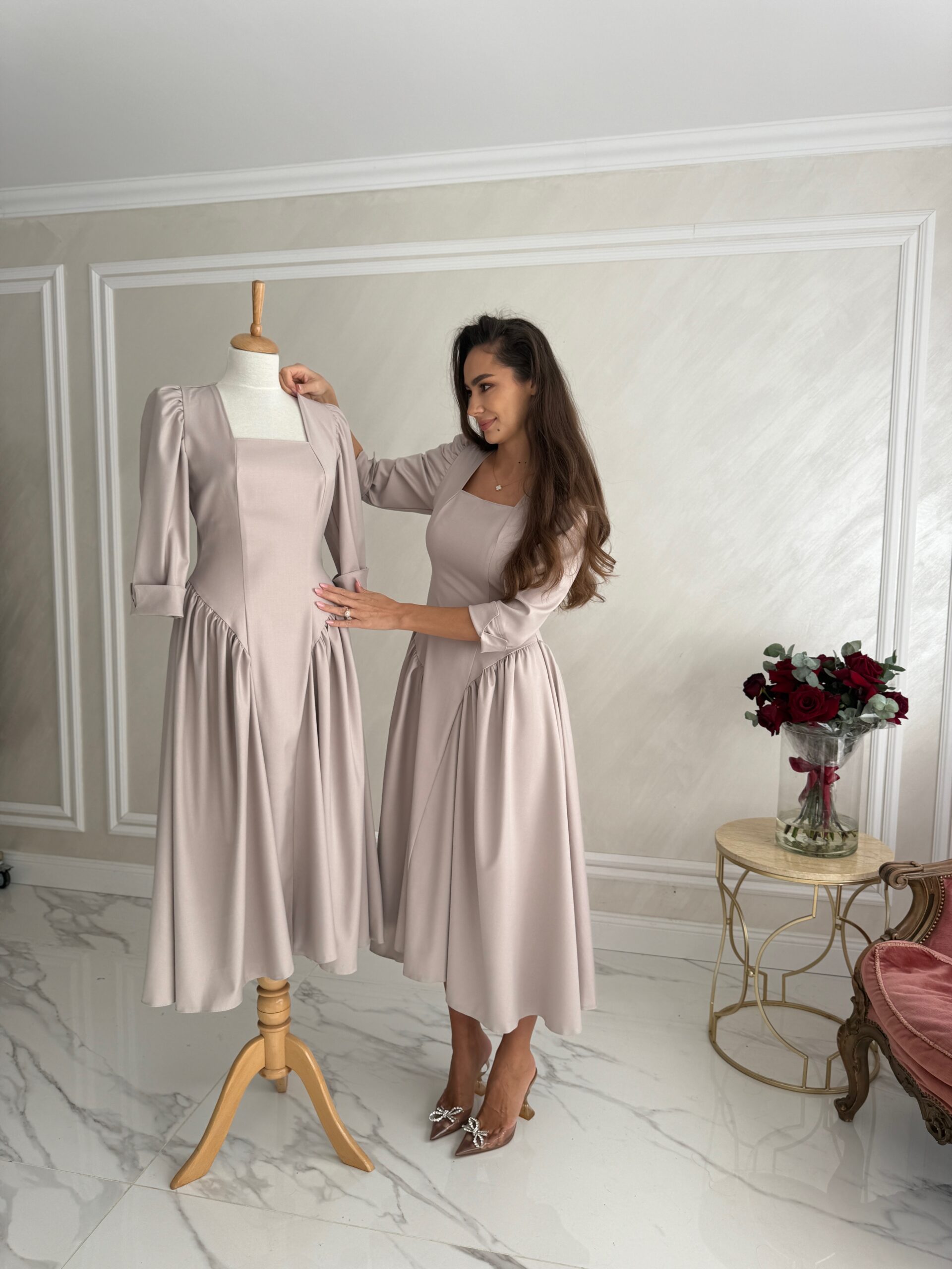Confecționată dintr-o țesătură fină, cu cădere frumoasă, rochia are un decolteu pătrat ce evidențiază delicat linia gâtului, iar mânecile trei sferturi o fac potrivită pentru sezonul de toamnă-iarnă.