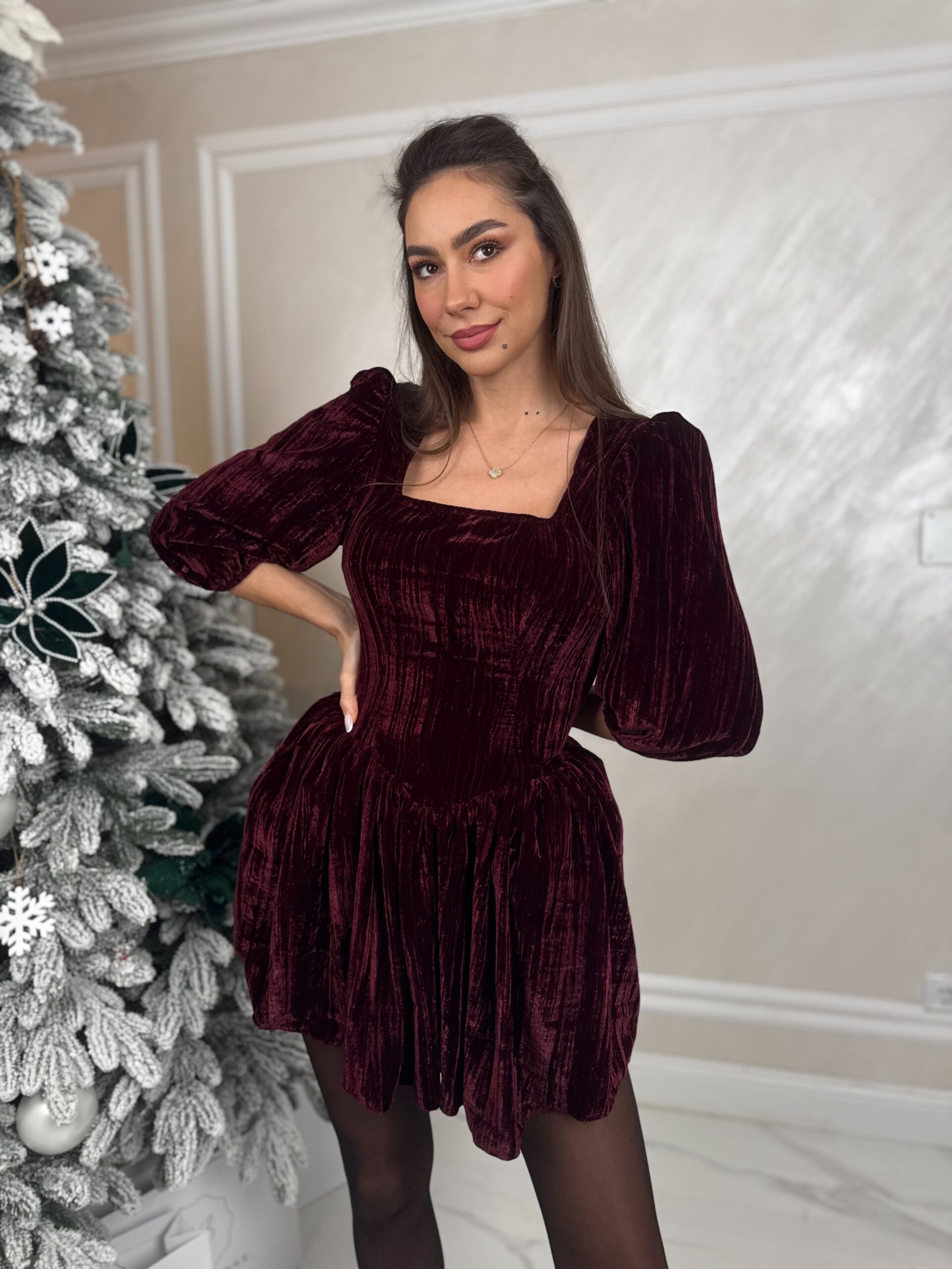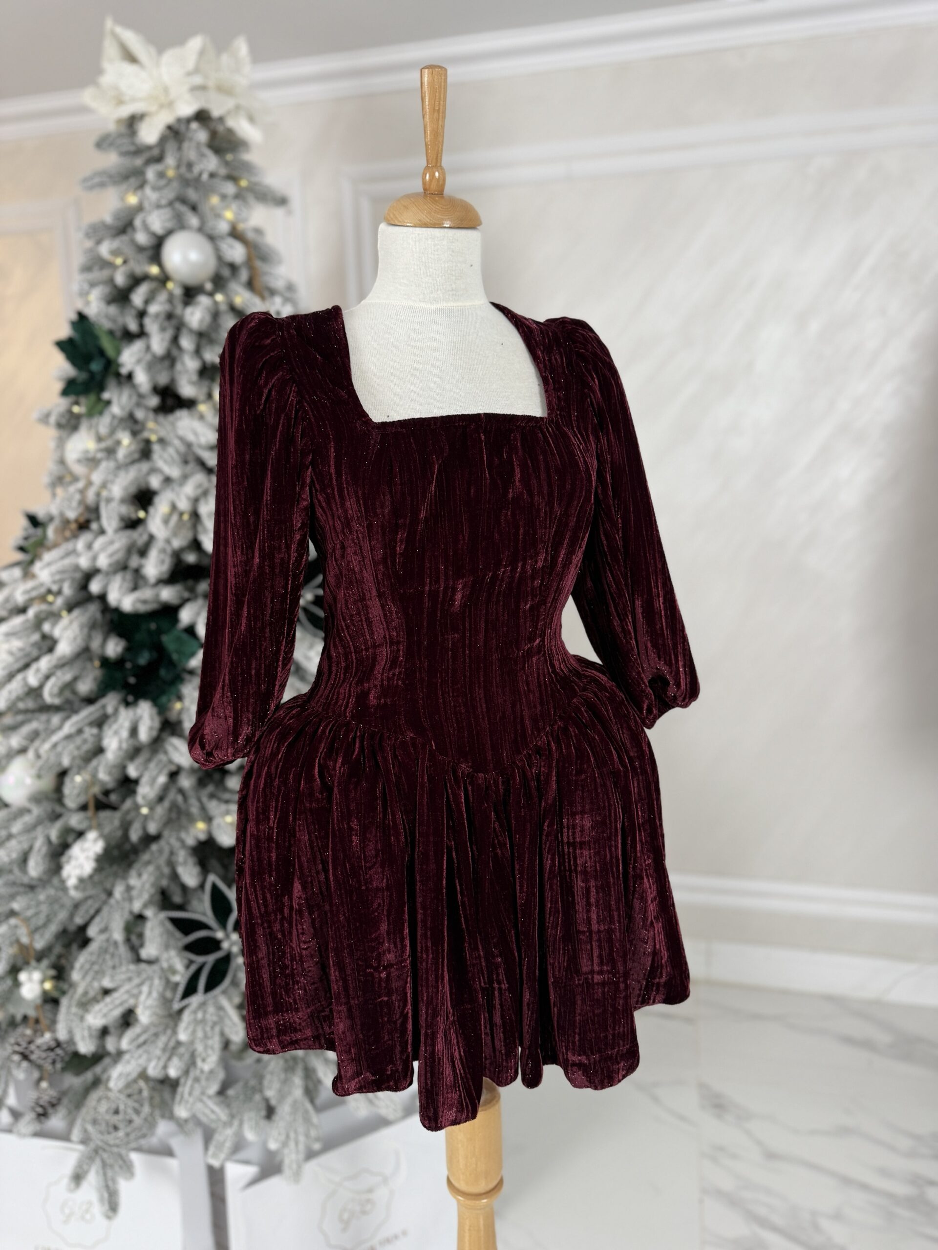 Confecționată din catifea raiată burgundy, cu particule fine strălucitoare, rochia captează lumina discret, oferind un plus de rafinament și eleganță. Croiala pune accent pe talie și șolduri, iar întăriturile laterale creează un efect vizual de subțiere a taliei și evidențiere a formelor feminine.